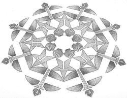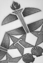 In this lace-like painting, Aric Obrosey combined three oil-company logos with the shine and shape of an oil spill. The doily's border is comprised of tiny droplets, which he says "symbolize the spilled oil breaking up and spreading outward." Although Obrosey meant to represent the oil industry's environmental disasters, he was invited to feature "Oily Doily" in Oil Patch Dreams: Images of the Petroleum Industry, an art exhibit sponsored by Texakoto and other oil concerns.